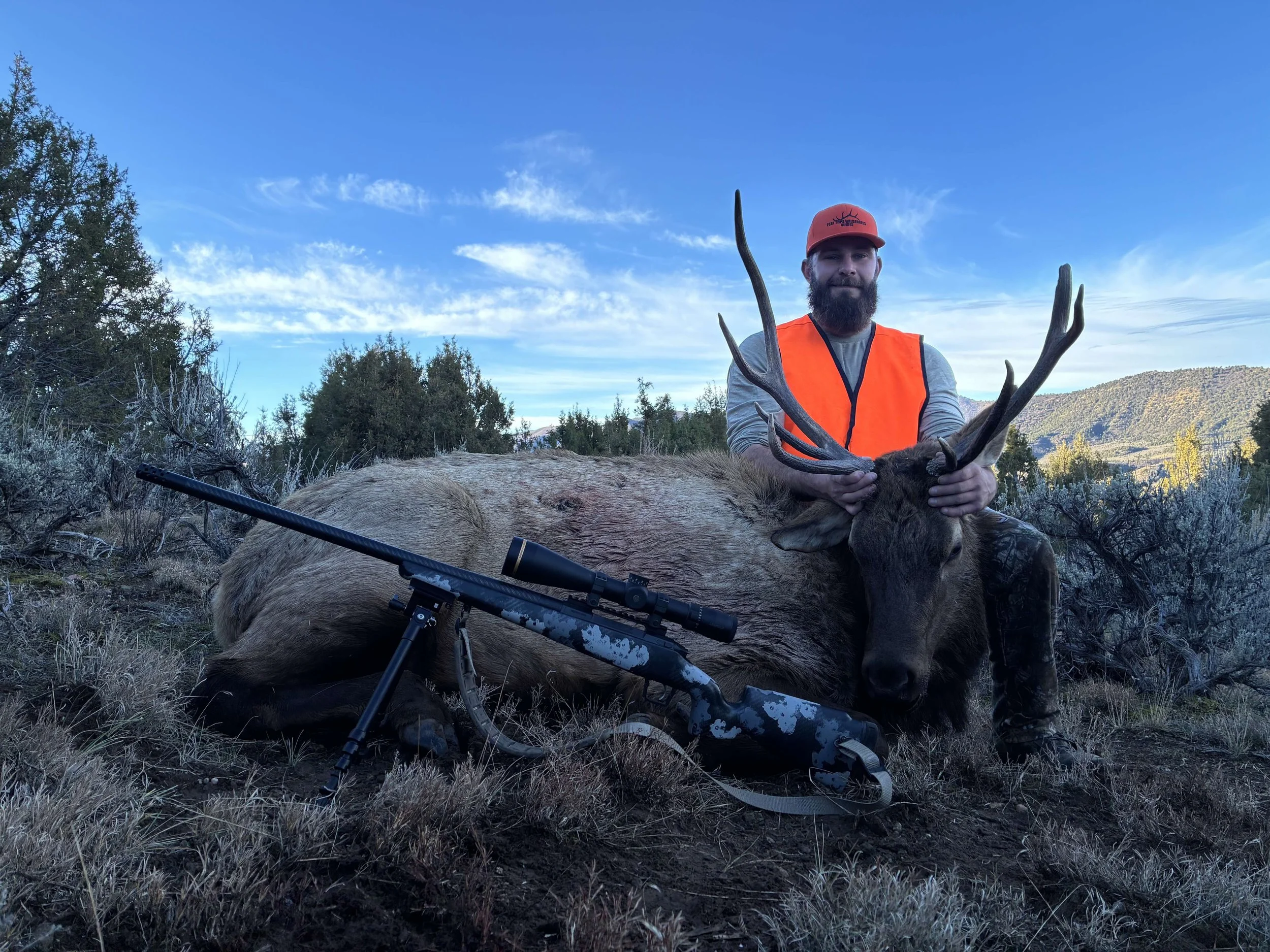 The temperatures continued to stay warm with no snow. We did a “trial run” on the private ground we are now leasing. Needless to say, it worked out. Jimmy booked a good high school buddy of his for this experimental hunt never have setting foot on the property until a few days before the season when getting a tour of the 7,000 plus acres. The first morning proved to be a success. Blake, the hunter, had an opportunity at this legal bull inside the first 2 hours of opening day. We do not run drop camps during the 4th rifle season as normally the weather is too rough!